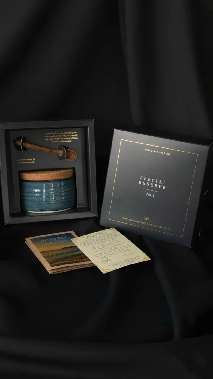 Each luscious crystal of multi-award winning Opito Bay sea salt has been carefully crafted through the combination of our three key ingredients sunshine + patience + love. After hand gathering pure sea water from one of Coromandel’s iconic beaches, the pristine Opito Bay. We filter and carefully solar evaporate our salt to create big, translucent crystals which bring out the coast’s unique minerality.