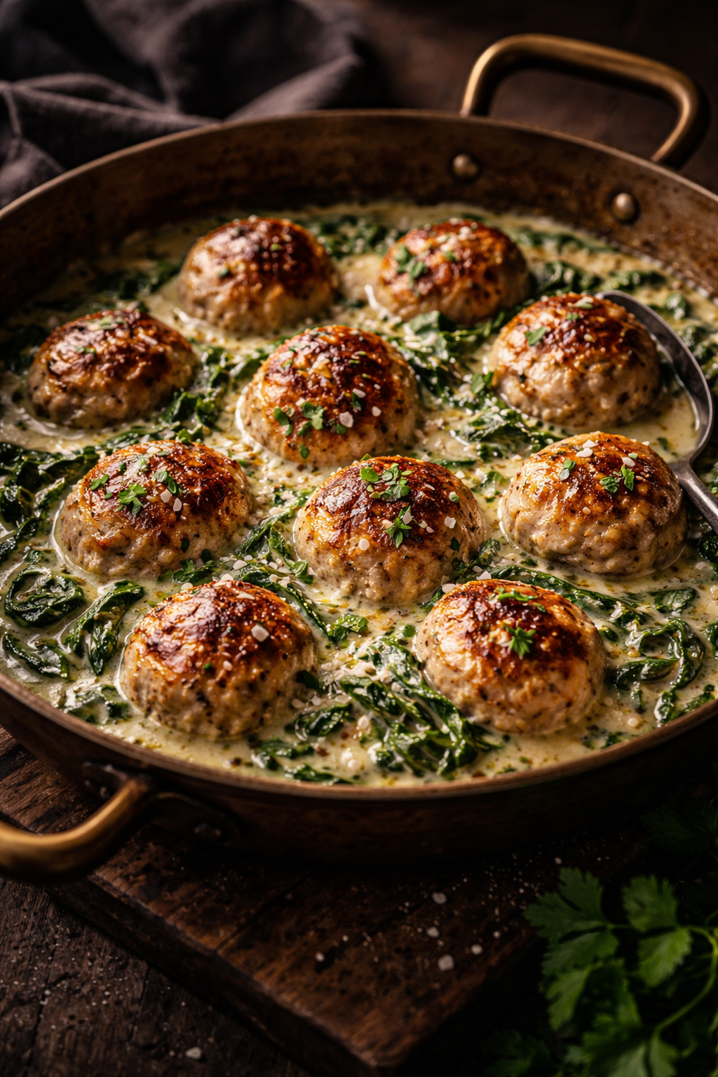 CHICKEN MEATBALLS WITH CREAMY LEMON AND SPINACH SAUCE.