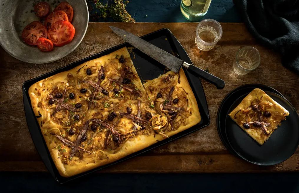 NOTES: Pissaladière is traditionally garnished with whole olives. If you can’t find Niçoise olives, you can use Greek Kalamata olives instead.